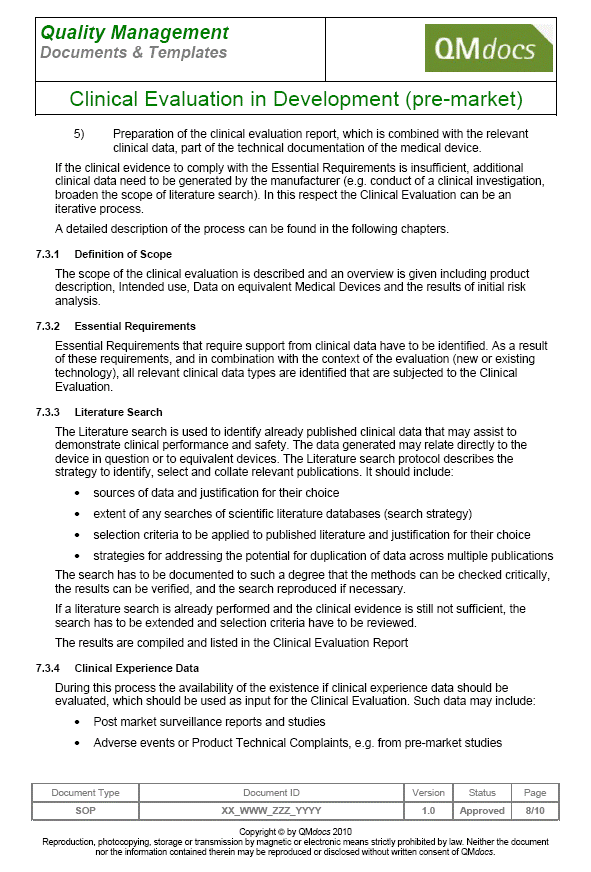 This Standard Operating Procedure (SOP) describes the individual steps and process necessary to comply with the Clinical Evaluation for medical devices. This SOP applies to all Medical Devices under development after concept and feasibility studies are completed.